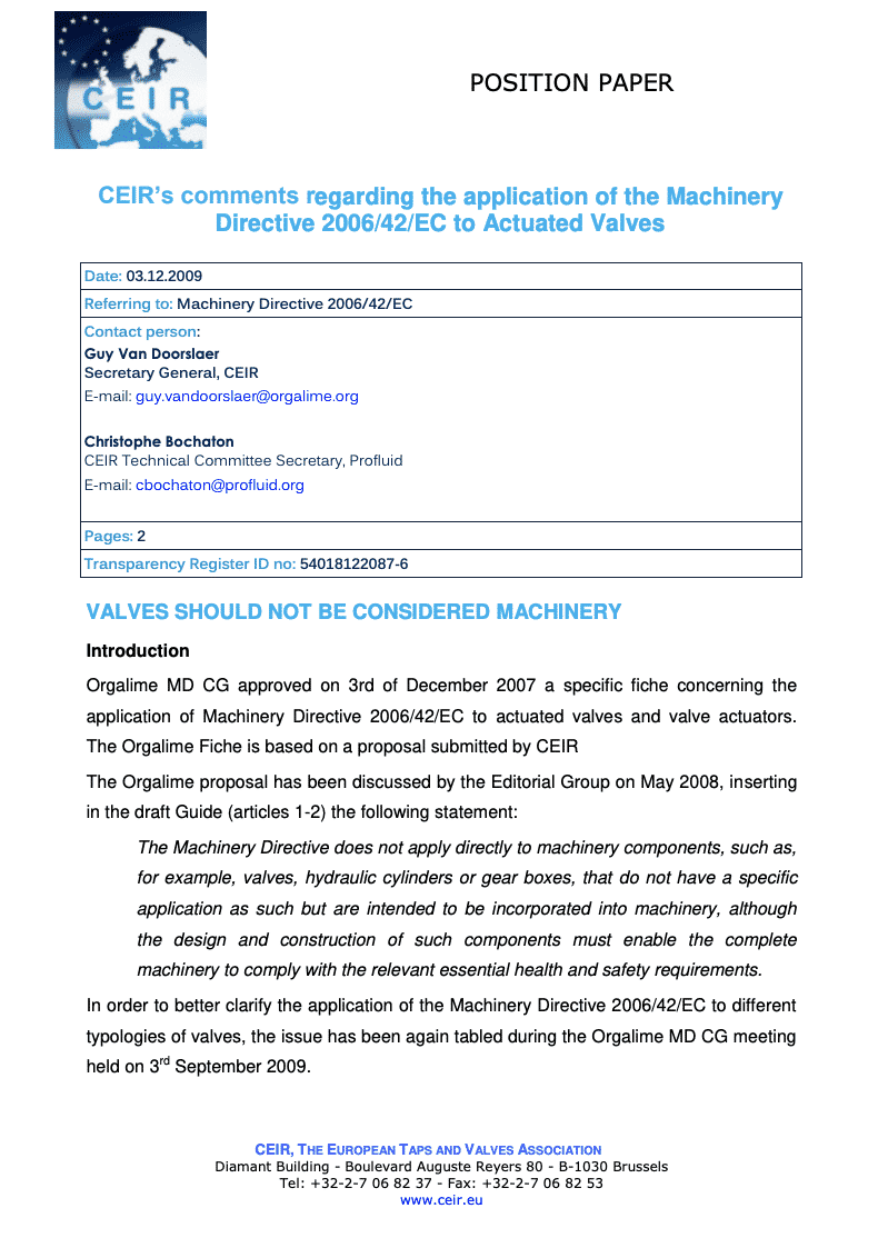 CEIR position paper over de toepassing van de machinerichtlijn op gestuurde kleppen. Let op: dit is een interpretatie van de CEIR.