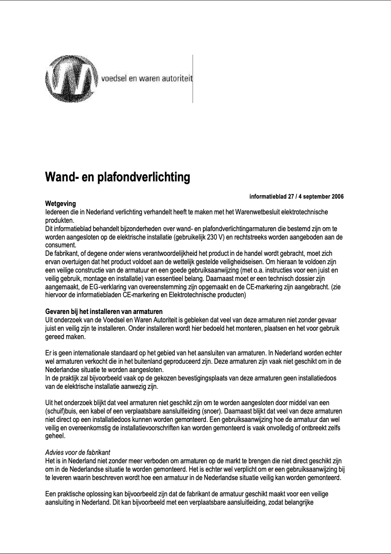 Brochure van de VWA over CE-markering op lampen en verlichting. Bij het in de handel brengen van lampen, dienen deze te voldoen aan o.a. de laagspanninsgrichtlijn.