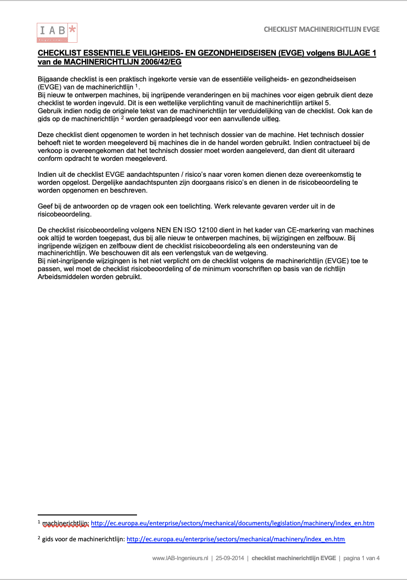 Checklist machinerichtlijn bijlage 1 met de Essentiële Veiligheids- en GezondheidsEisen (EVGE). Dit is een korte versie van de eisen van bijlage 1 van de machinerichtlijn 2006/42/EG. Voor de beoordeling volgens bijlage 1 van de machinerichtlijn is ook een uitgebreide lijst beschikbaar. Zie excel bestand.