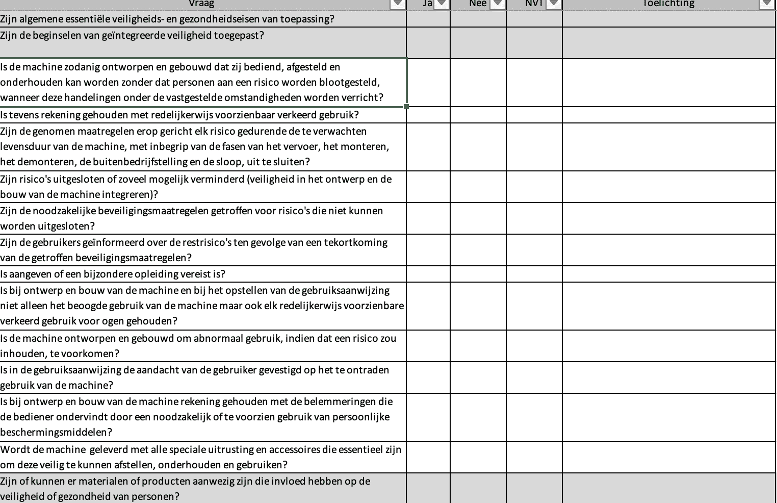 Een Excel lijst met de voorschriften van bijlage 1 van de machinerichtlijn. Voor nieuwe machines is het verplicht om na te gaan of deze aan de essentiële eisen voldoen. Een uitwerking van deze (of een soortgelijke lijst) dient in het technisch dossier aanwezig te zijn.