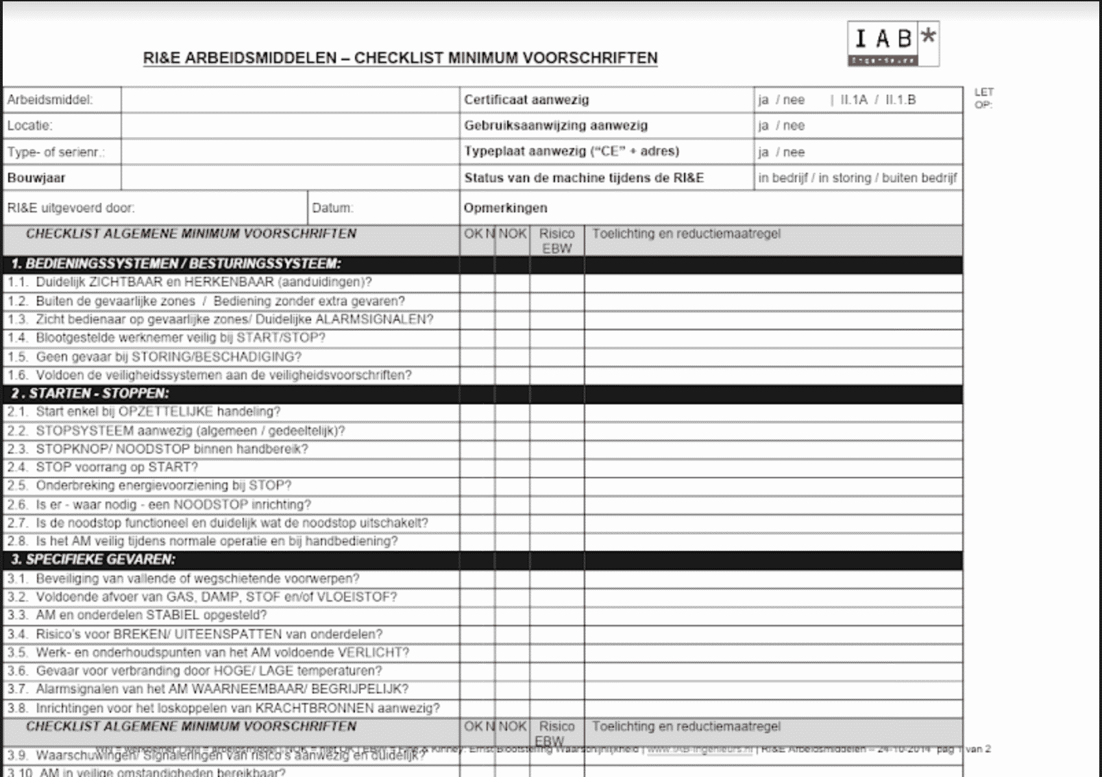 Een nieuwe machine met CE-markering dient door de werkgever altijd nog te worden gecontroleerd middels een RI&E. De ‘Checklist minimum voorschriften voor arbeidsmiddelen’ is gebaseerd op de Europese richtlijn arbeidsmiddelen. In Nederland is de richtlijn Arbeidsmiddelen opgenomen in de Arbowet. In België is het onderdeel van de Codex. De checklist minimum voorschriften is de controle die altijd moet worden gedaan. Daarnaast wordt aanbevolen om de risicobeoordeling te maken volgens de EN ISO 12100.