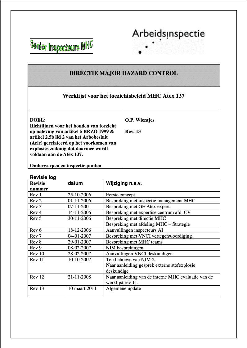 Dit document bevat zowel de toelichting als ook de werklijst voor de inspectie van ATEX in met name de BRZO (Seveso) bedrijven.