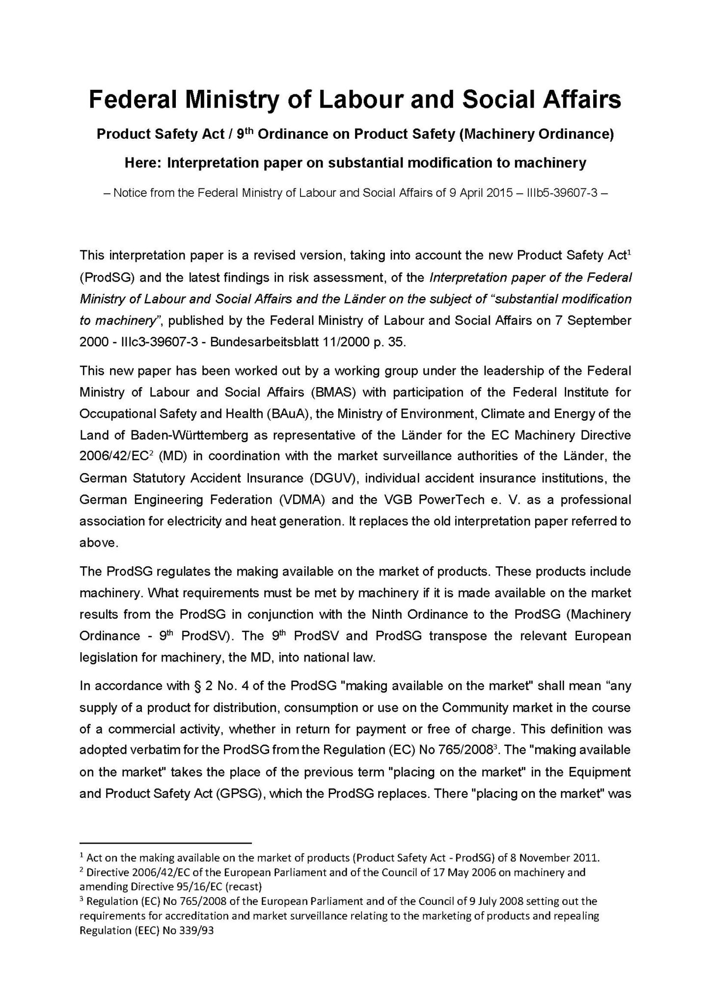 This interpretation paper is a revised version, taking into account the new Product Safety Act1 (ProdSG) and the latest findings in risk assessment, of the Interpretation paper of the Federal Ministry of Labour and Social Affairs and the Länder on the subject of “substantial modification to machinery”, published by the Federal Ministry of Labour and Social Affairs on 7 September 2000 – IIIc3-39607-3 – Bundesarbeitsblatt 11/2000 p. 35.