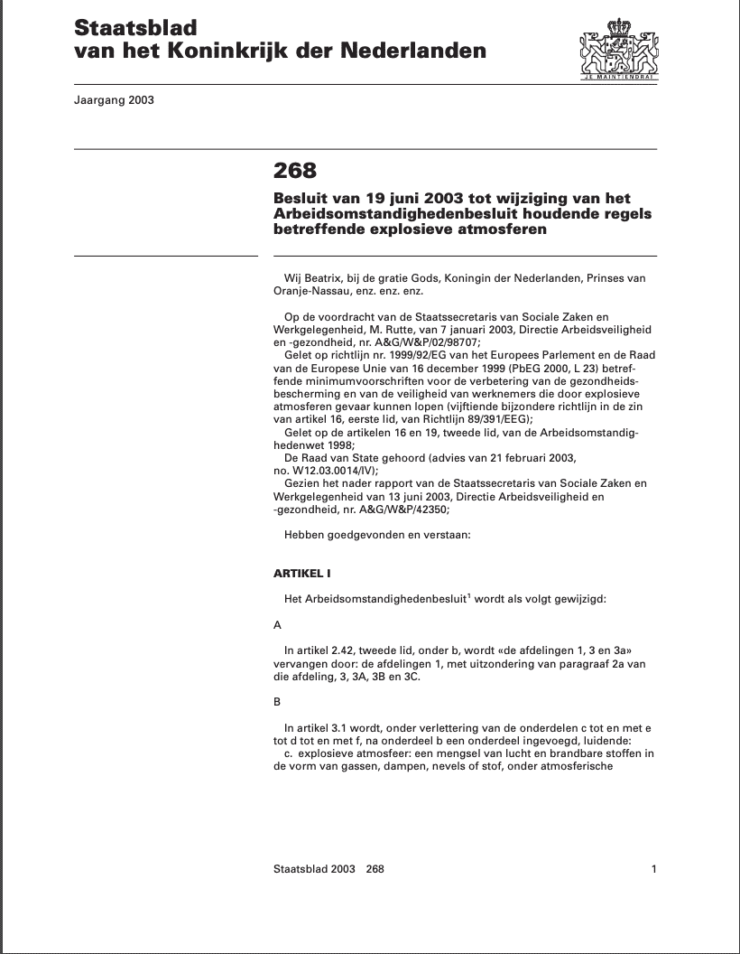 Besluit van 19 juni 2003 tot wijziging van het Arbeidsomstandighedenbesluit houdende regels betreffende explosieve atmosferen.